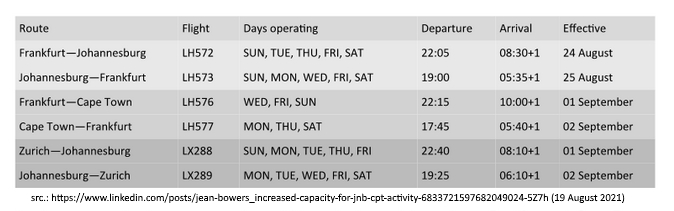 Effective from 24 August 2021, Lufthansa will increase capacity between Frankfurt Airport (FRA) in Frankfurt, Germany, and OR Tambo International Airport (JNB) in Johannesburg to five weekly flights. Additionally, the airline will increase flights between Frankfurt and Cape Town International Airport (CPT) in Cape Town to three weekly flights.
